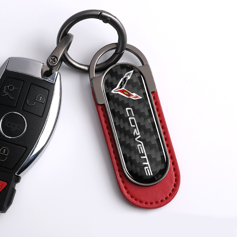 Corvette C8 Carbon Fiber Red Leather Metal Keychain